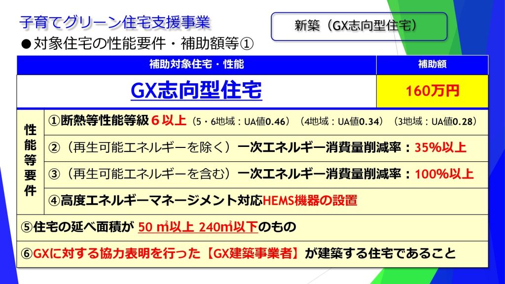 中でもZEH水準を大きく上回る省エネ性能を有する脱炭素志向型の住宅として注目なのが、「GX志向型住宅」になります。補助金額160万円と1棟当たりの補助額としてはかなり大きな金額になりますが、その分性能のハードルも高めの設定となります。