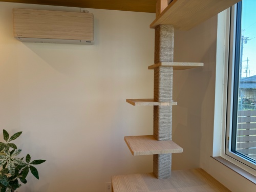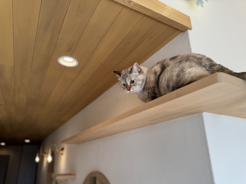 リビングの吹抜けをぐるっとめぐるキャットウォーク。間接照明も活かされインテリアに溶け込んでいますが、猫ちゃんの動線に配慮して通り抜けできます!