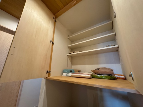 専用トイレの上にワンちゃん、ねこちゃんグッズをまとめて収納。トイレマットや猫砂ストックなど収納位置が決まっていれば、出し入れらくらく、ストックも一目瞭然ですね。