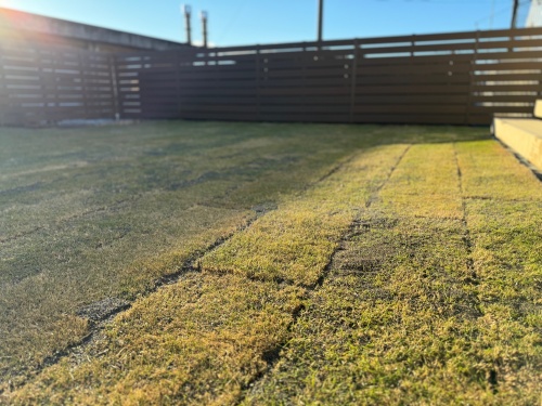 天然芝の魅力はなんといっても質感の良さですね。ふかふかした肌触りと天然ならではの柔らかさはとっても心地いい。愛犬くんや子供たちが転んでも安全です。