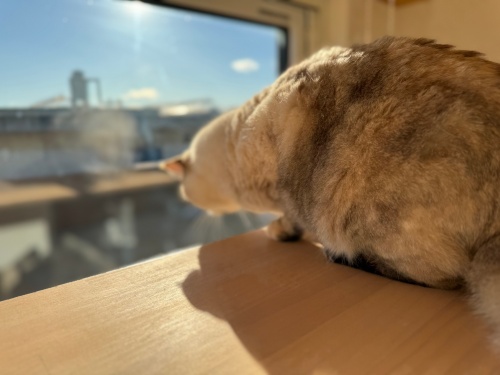 高い窓から眺める景色は最高。ななめに寝っころびながらのお昼寝も格別にゃ。1日20時間近く眠るあたしたちには最高の場所にゃ。