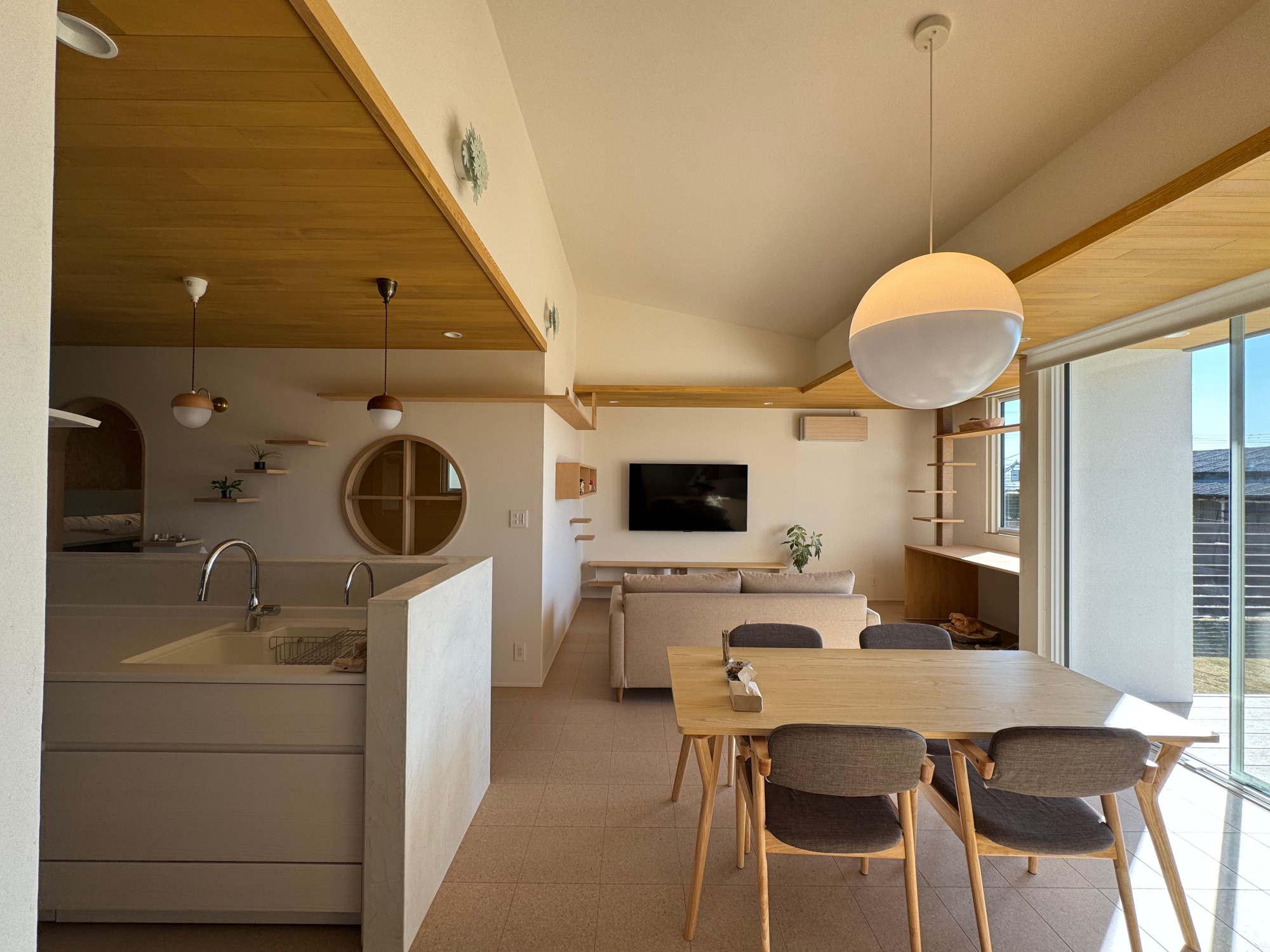 キッチンを中心にした回遊性のある間取りにすることで、全体に視線が行き届くと同時に行き止まりが無いことで、動物たちもストレスなく動けます。