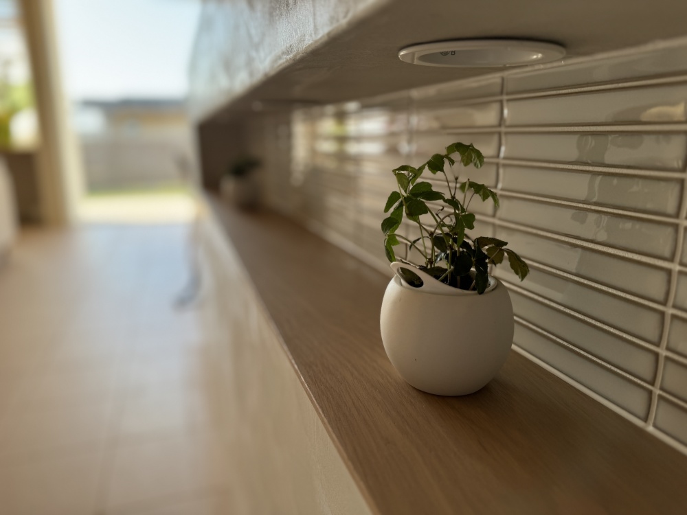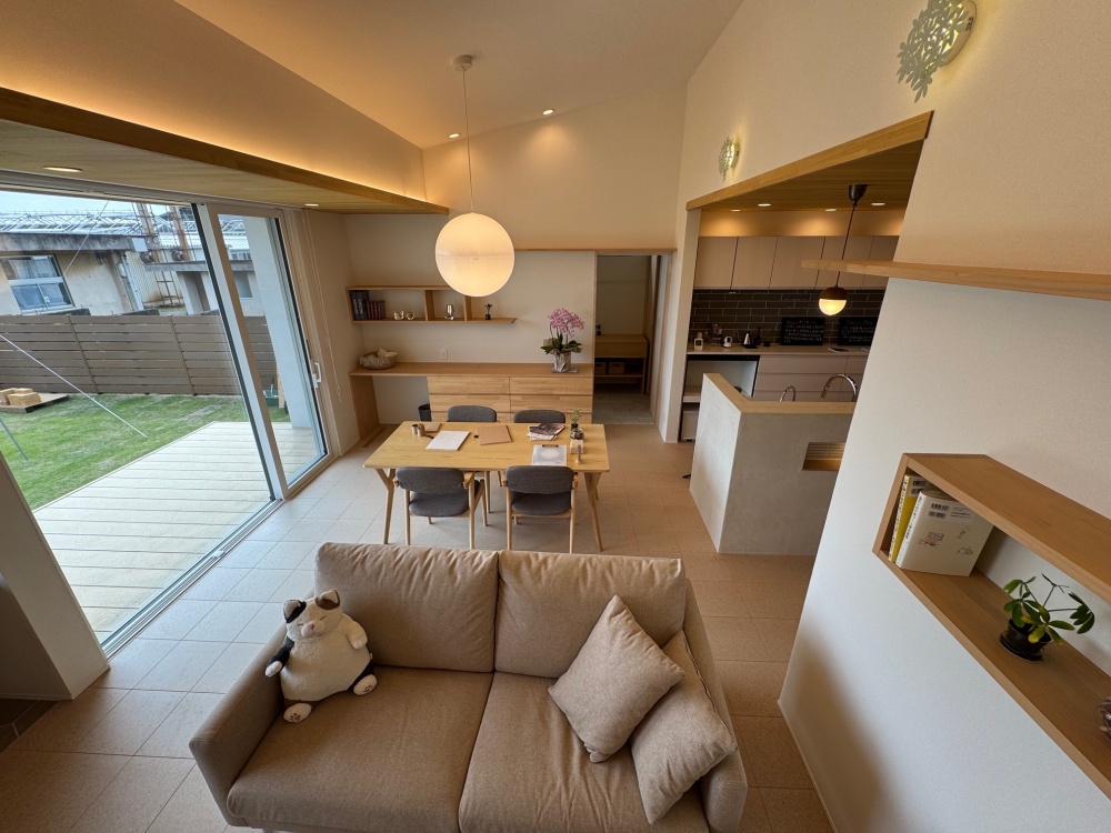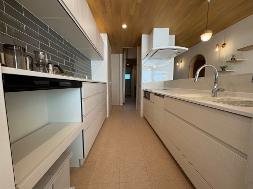 ワンちゃんは狭いところが落ち着くため、リビングの一角に専用スペースを設けることで、視線が届き安心感を覚えます。また床はタイル貼りのため、夏はひんやりして気持ちいいです。体温調節の苦手なワンちゃんには過ごしやすいスペースです。