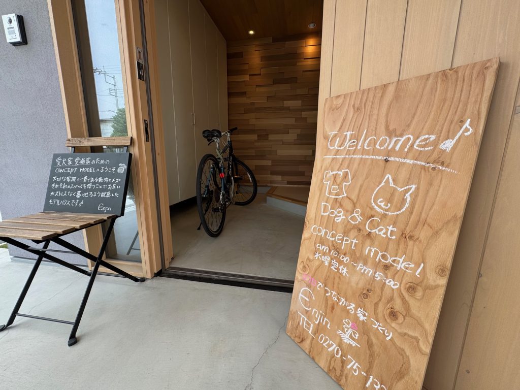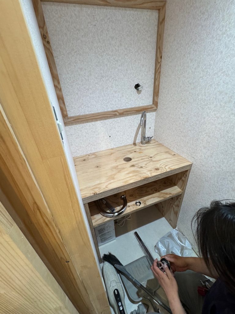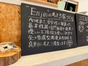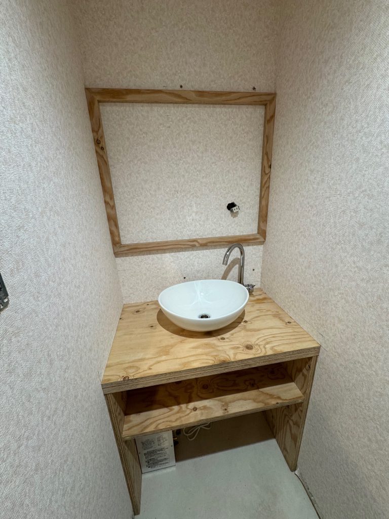 看板作ってみた♪ 投稿日 2025-05-16 更新日 2025-09-11 著者 enjin_user カテゴリー NEWS 現場で余った床に貼る合板のあまりを活用して事務所の洗面台を製作している最中。さらに余ったので展示場の入口に看板を作ってみた。 合板の表面をグラインダーで平滑にしてからチョークで文字を書いてあら完成!材料費ほぼかかってない割りになかなかマッチしました。ゴミにならなくて良かった。 洗面台も壁をあまりの漆喰で塗って、鏡を取り付けたら完成です。お金を掛けなくても手作り感があっていいですね♪