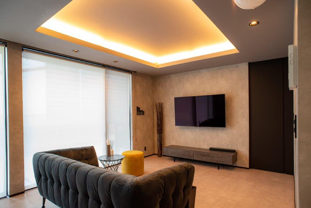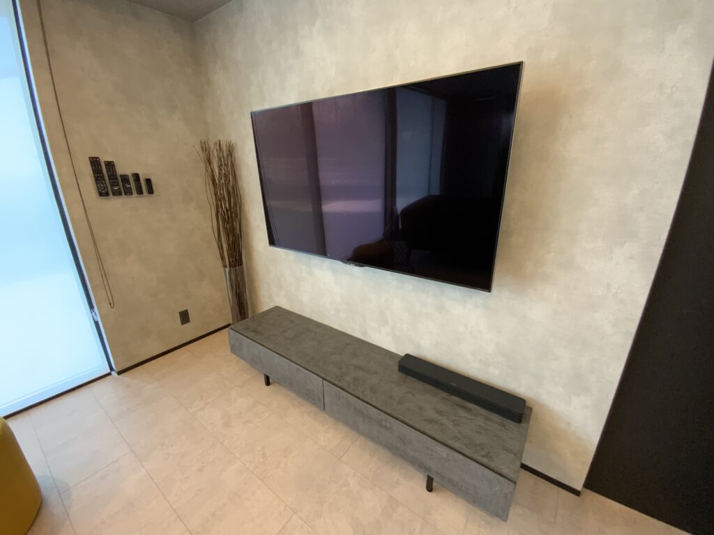 TV台は既製品にモールテックスを塗って、壁掛けTVまで壁の中を隠蔽配管。