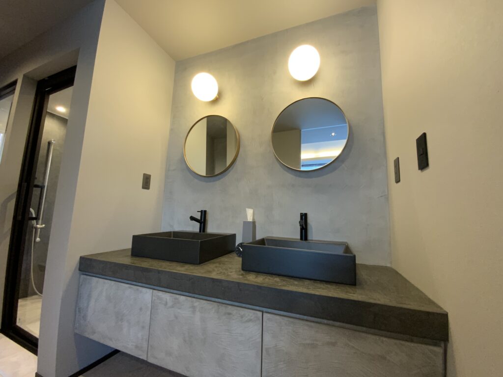 洗面ボウルと水栓はmiratap,スイッチ類は神保などデザインにこだわりのメーカーの商材