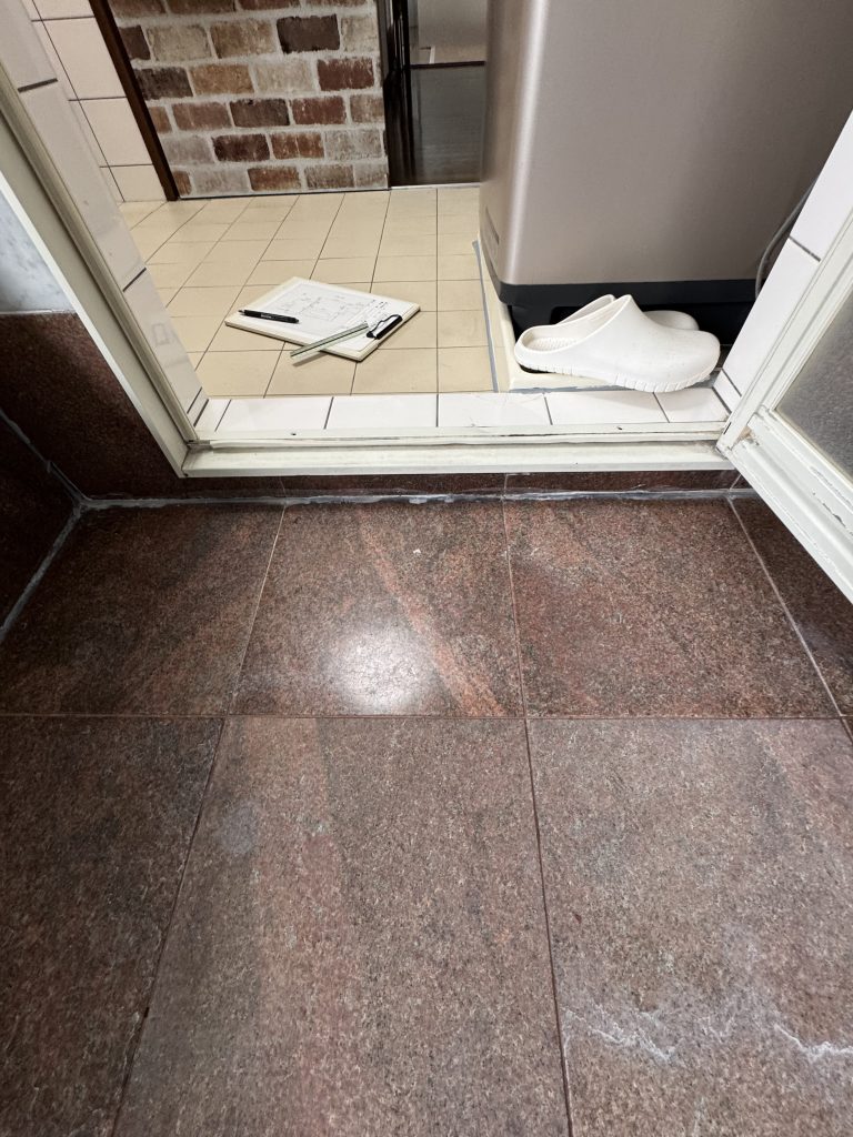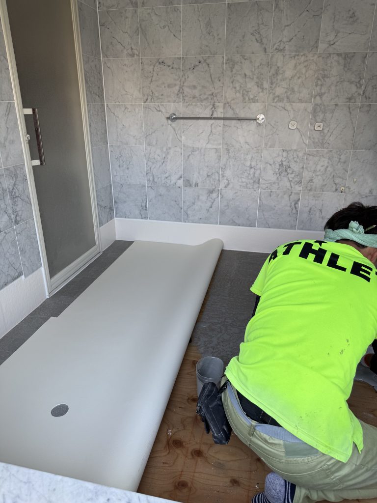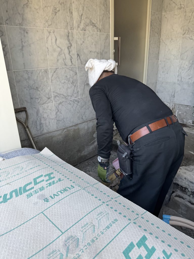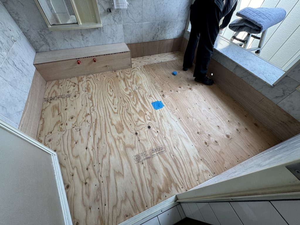 大理石を壊して新たに床を作り替えし、防水工事を施したうえで浴室用のクッションフロアを貼ることになりました。