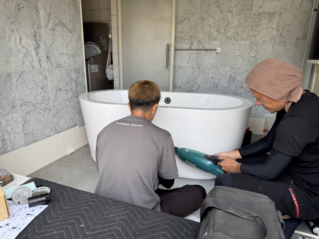 新しい浴槽に循環金具を設置するため穴を開けて、排水を繋いだら位置を決定。